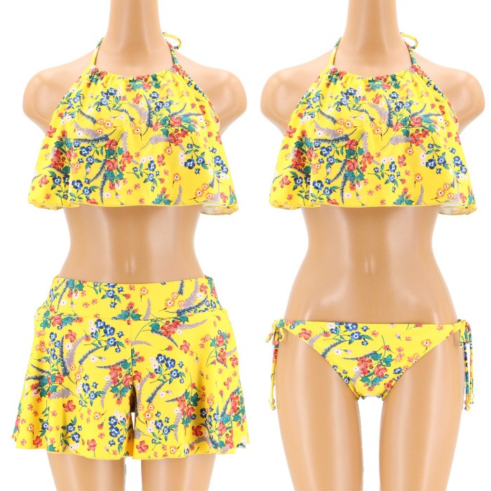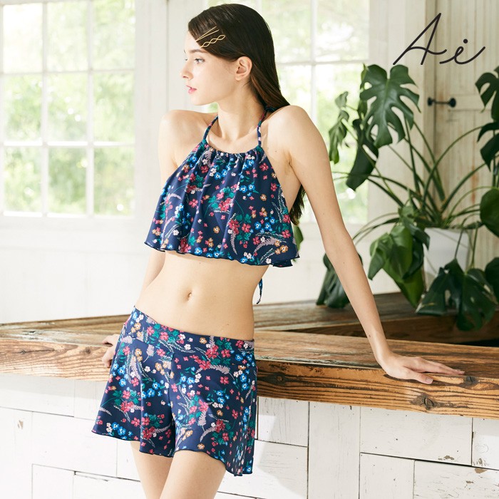 【AI Blue】Paradise flower フレアハイネックトップ付 ワイヤー 3点セット水着 9号 水着 みずぎ ミズギ 3点セット水着 レディース水着